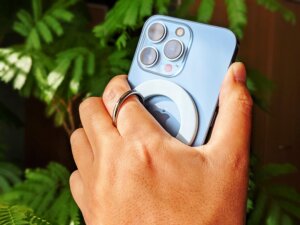 スマホ(iPhone 13 Pro)と比較するとこんな感じのサイズ感。