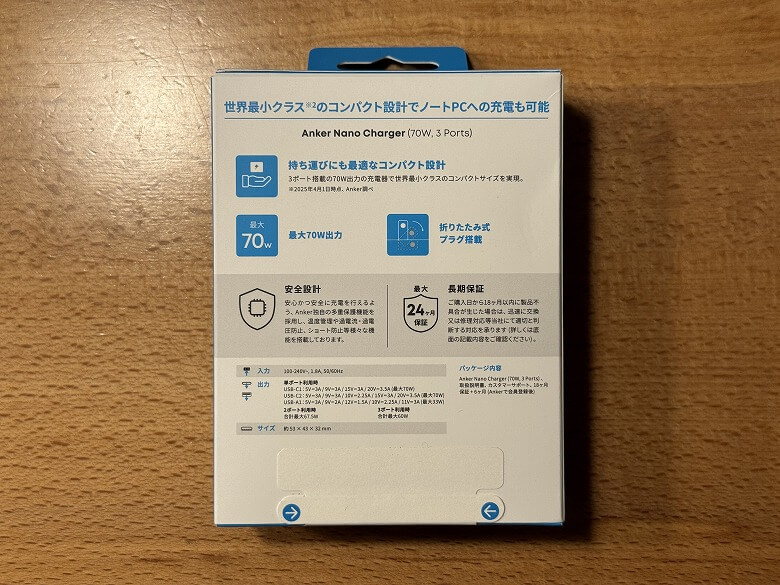「Anker Nano Charger (70W, 3 Ports)」の外箱は、白基調で青をアクセントカラーにしたシンプルなデザインです。
