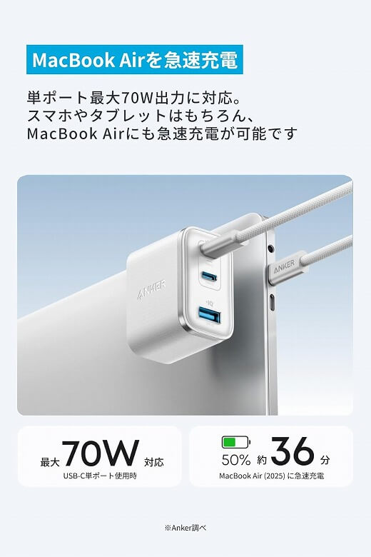 「Anker Nano Charger (70W, 3 Ports)」は単ポートで最大70W出力に対応し、スマホやタブレットはもちろんMacBook Airにも急速充電が可能です。