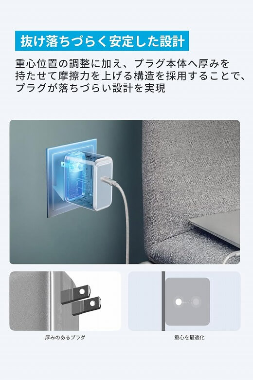 複数枚のGaN搭載ICチップを内蔵することで電力変換効率を高め、一般的な充電器と比較して約55%の小型化を実現しています。