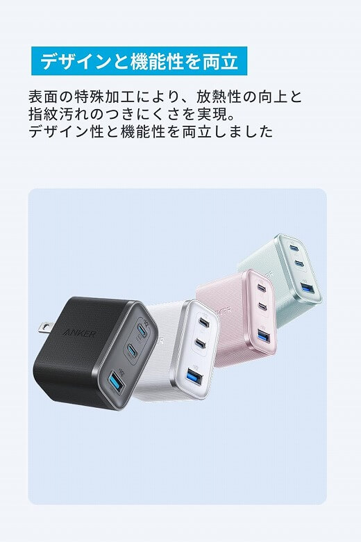 「Anker Nano Charger (70W, 3 Ports)」の外観は黒で統一され、表面に凹凸のある加工がされています。