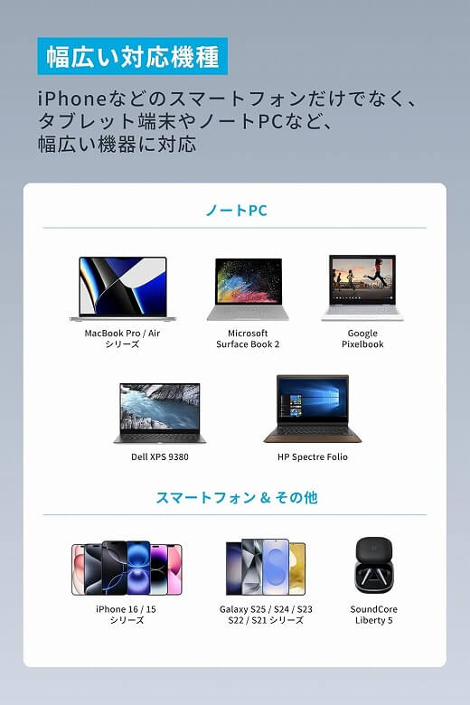 iPhoneなどのスマートフォンだけでなく、タブレットやノートPCなど幅広い機器に対応しています。