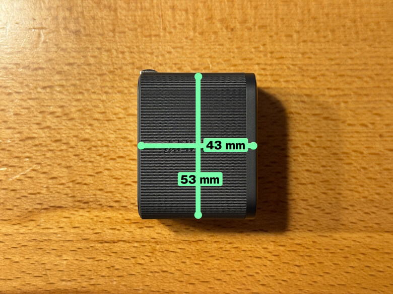 「Anker Nano Charger (70W, 3 Ports)」のサイズは53 × 43 mmです。