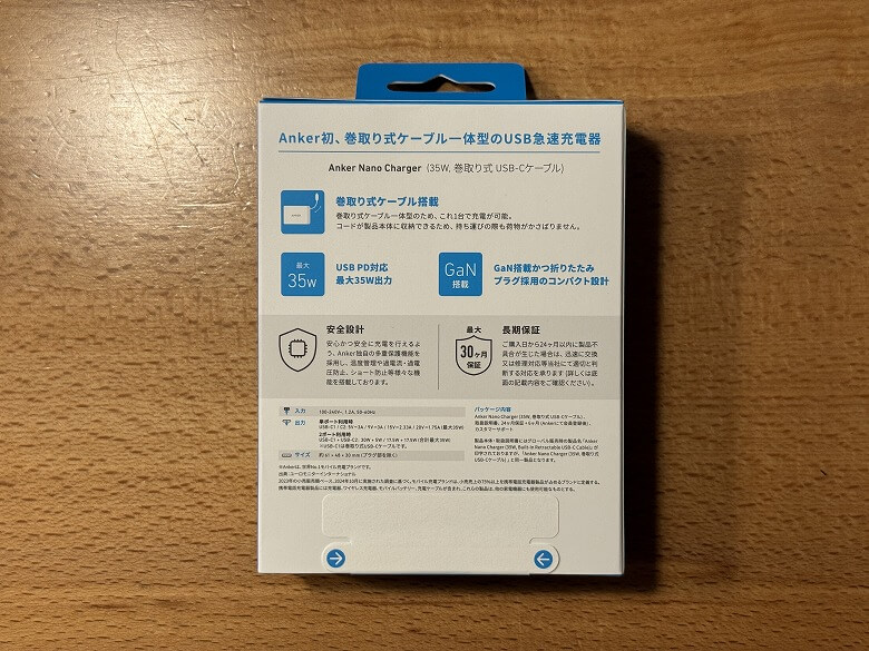 「Anker Nano Charger (35W, 巻取り式 USB-Cケーブル)」の外箱は、白基調で青をアクセントカラーにしたシンプルなデザインです。