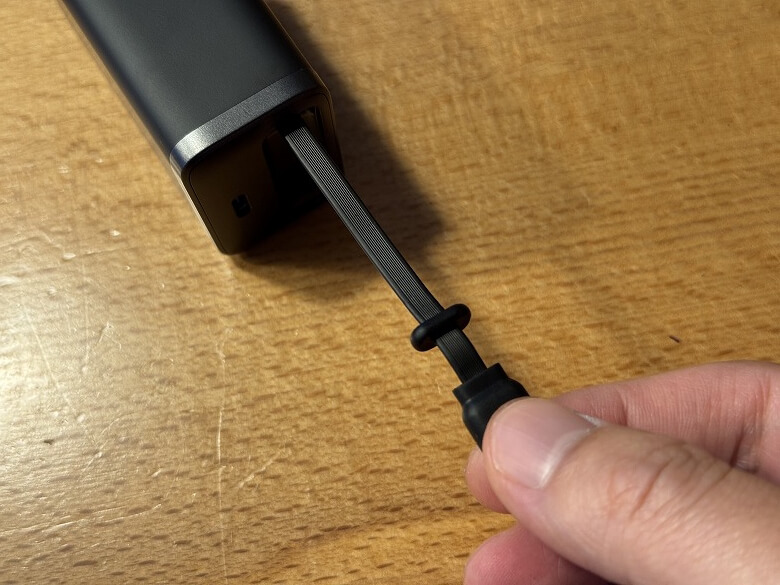 正面にはUSB Type-Cポートが1つと巻取り式のUSB-Cケーブルがあります。