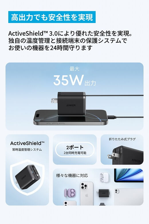 さらに出力は最大35Wに対応しており、スマートフォンやタブレットだけでなく、MacBook AirなどのノートPCにも急速充電が可能。