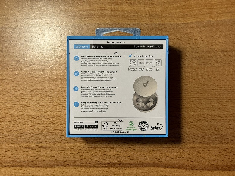 「Anker Soundcore Sleep A20」の外箱は、白を基調としたシンプルなデザインです。