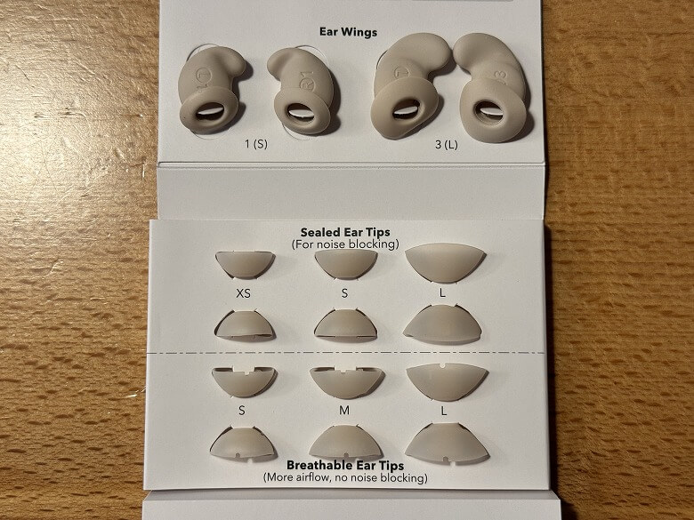 イヤーウィングはS、M、Lの3種類、密閉型イヤーチップはXS、S、M、Lの4種類、高通気性イヤーチップはS、M、Lの4種類のサイズが付属しています。