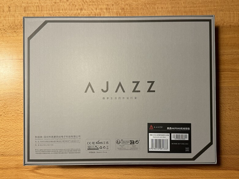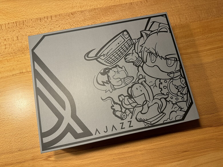 「AJAZZ AKP846 ディスプレイメカニカルキーボード」の外箱は、グレーを基調としたポップなデザインです。