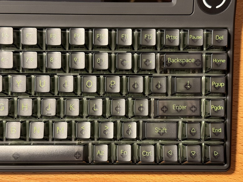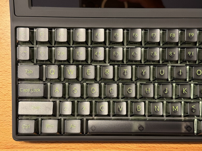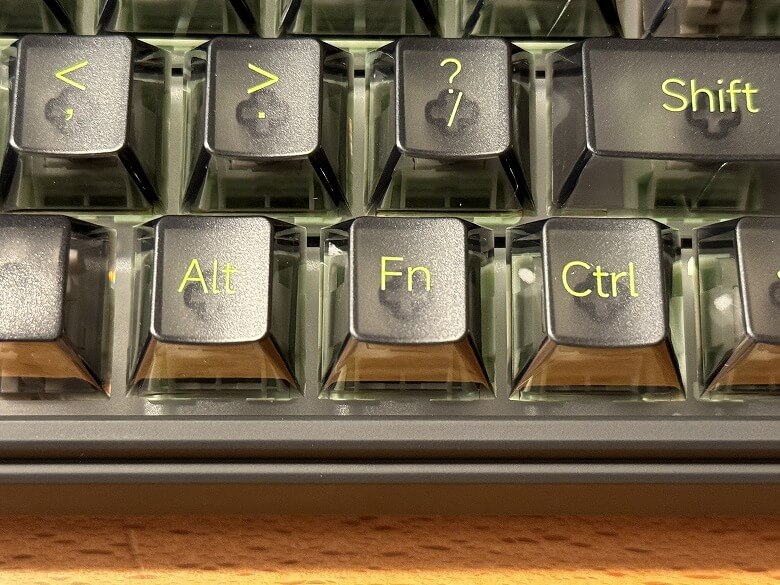 キーキャップの素材にはABSが採用され、半透明で中が薄く見えるようになっています。