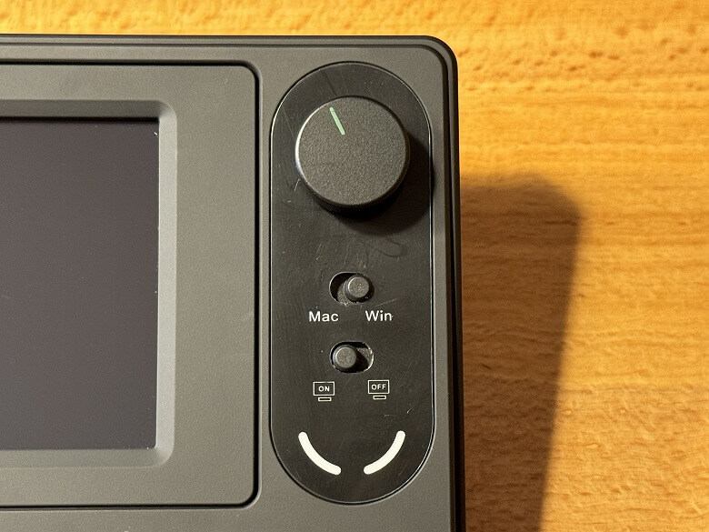 ディスプレイの右側にはボリューム調整ノブ、Mac/Win切り替えスイッチ、スクリーンスイッチがあり、その下にはCaps Lockとスクロールが割り当てられています。