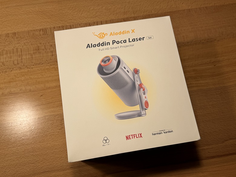 「Aladdin Poca Laser」の外箱は、白基調でポップなデザインです。