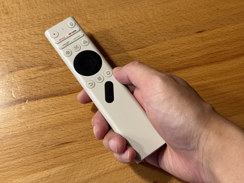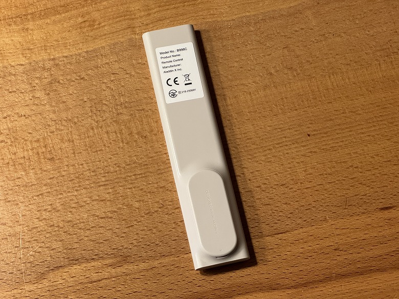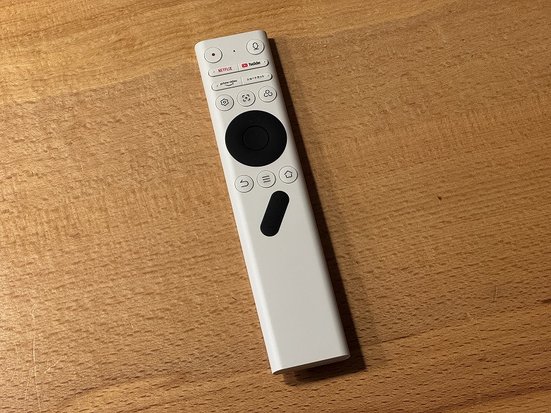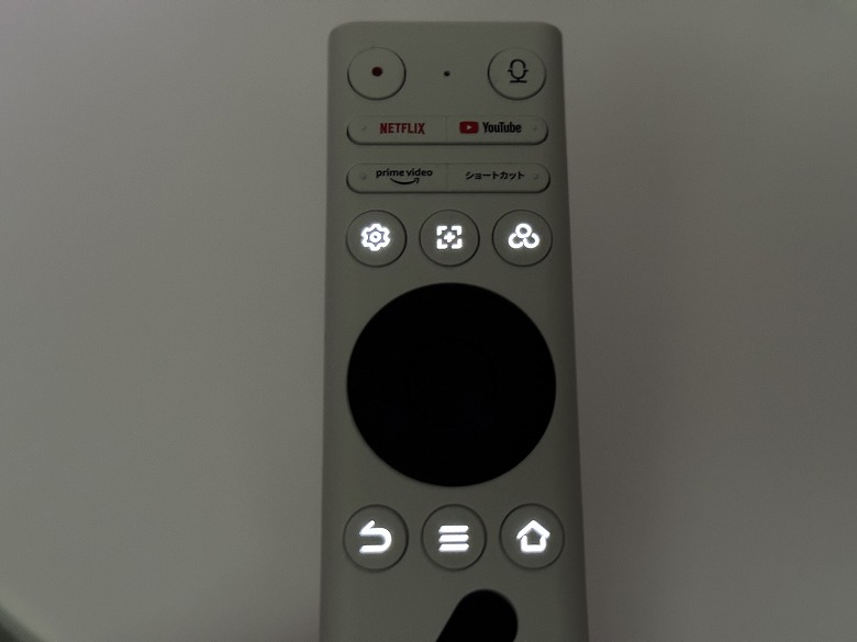 リモコンは白を基調とし、ボタンにバックライトがあるので暗くても視認性が良く使えます。