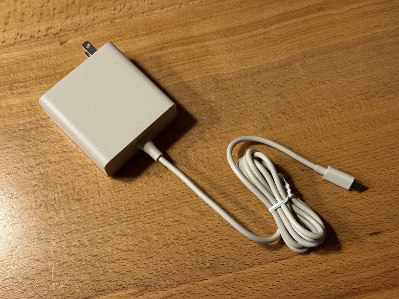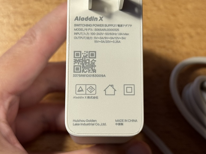 電源アダプターの側面には仕様が記載されています。
