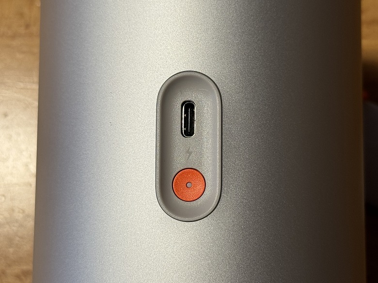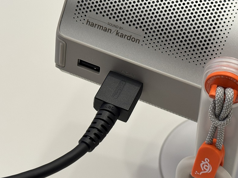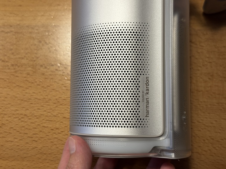 側面には電源ボタンとUSB Type-Cポートがあり、下部にはHarman Kardonのスピーカーが搭載されています。