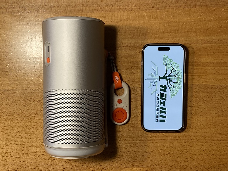 スマホ(iPhone 15 Pro)と比較するとこんな感じのサイズ感。