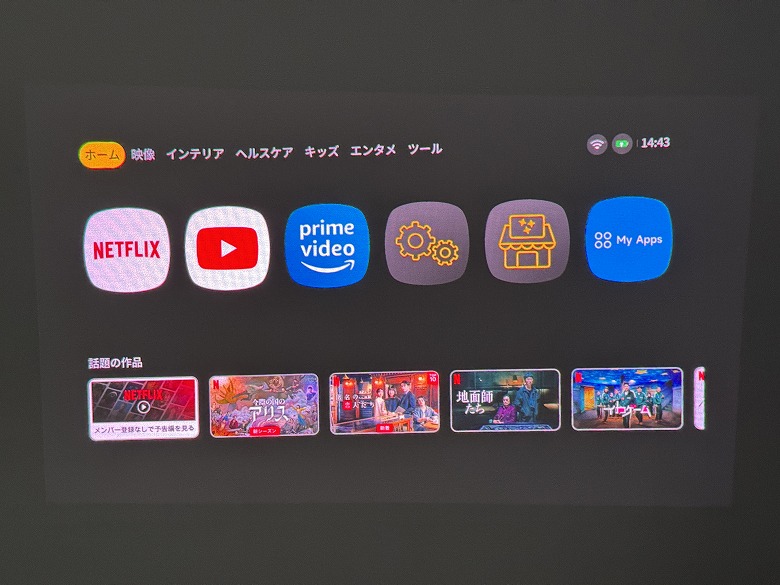 「Aladdin Poca Laser」はAndroidをベースにしたAladdin OSが搭載されており、初期設定を済ますとすぐに起動します。