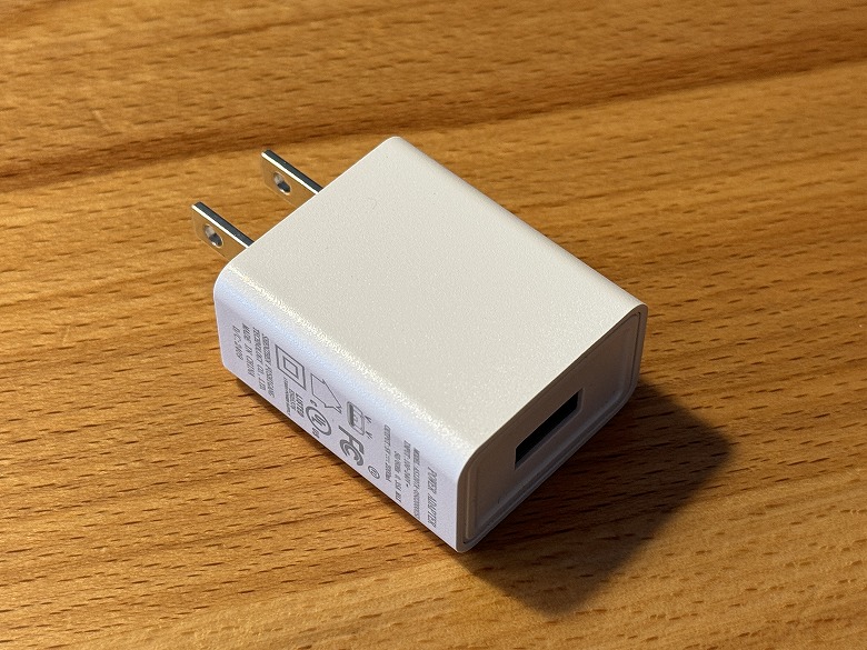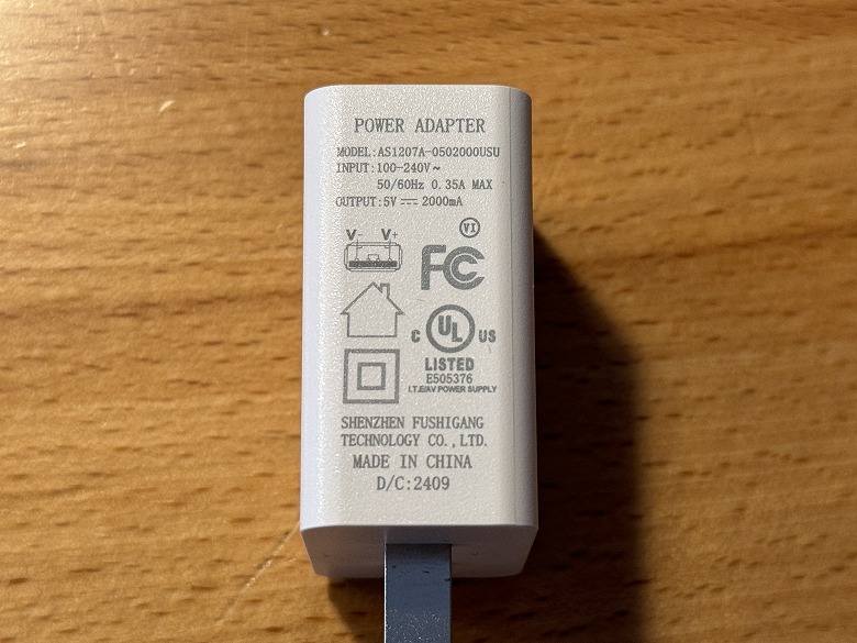 電源アダプターは白く、側面に仕様が記載されています。
