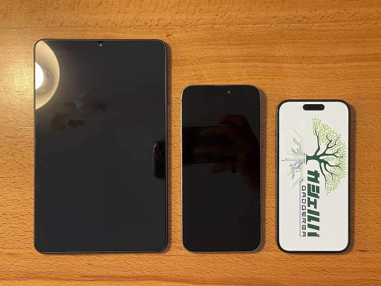 6.1インチの「iPhone 15 Pro」、6.7インチの「iPhone 15 Pro Max」と比較するとこんな感じのサイズ感。