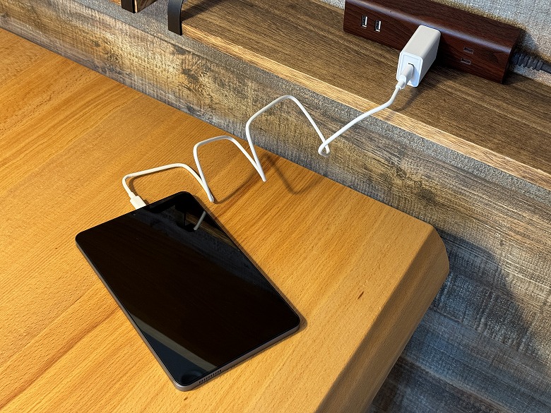付属の電源アダプターとUSB Type-A to Cケーブルを電源に接続して充電します。