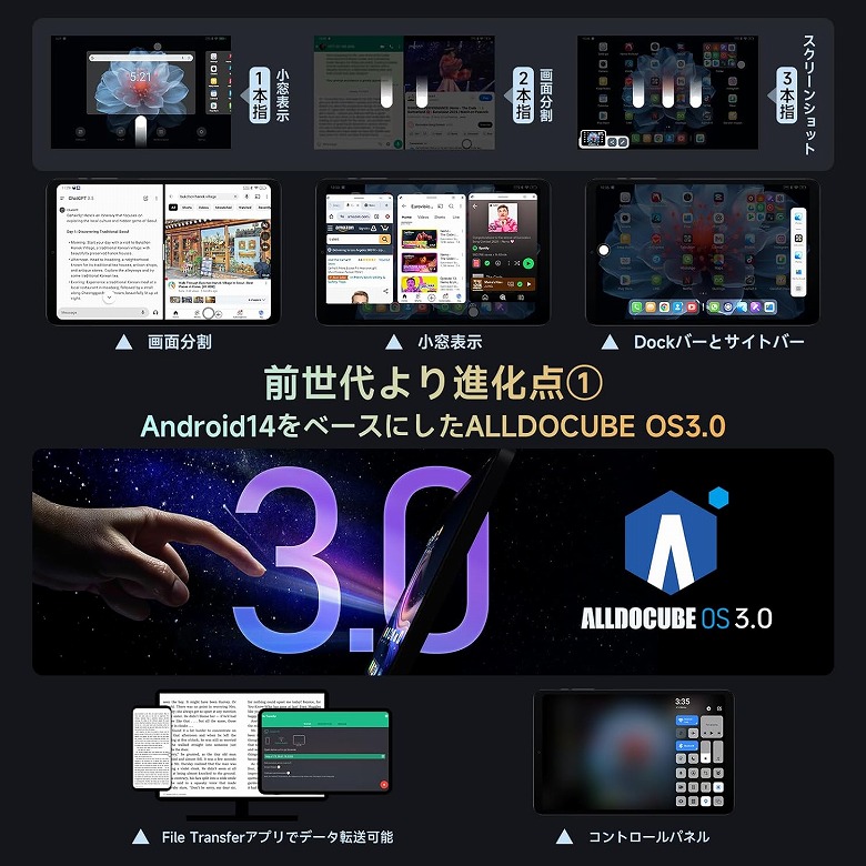 Android 14を基本としてカスタマイズしたALLDOCUBE OS 3.0を搭載し、機能豊富で様々な用途に使えます。