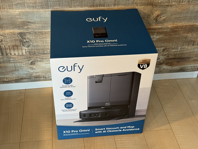 「Anker Eufy X10 Pro Omni」の外箱は、白と青を基調としたシンプルなデザインです。