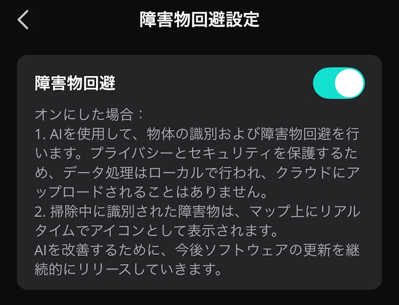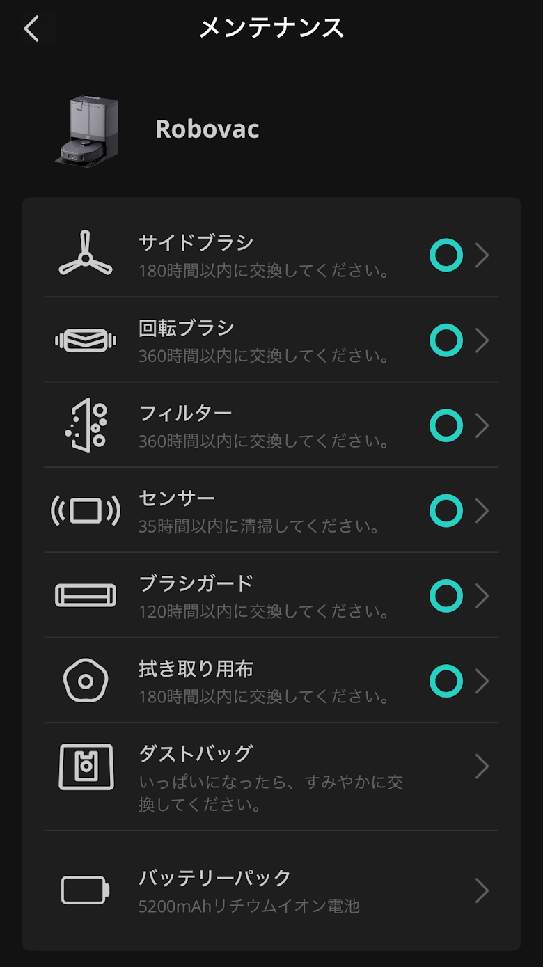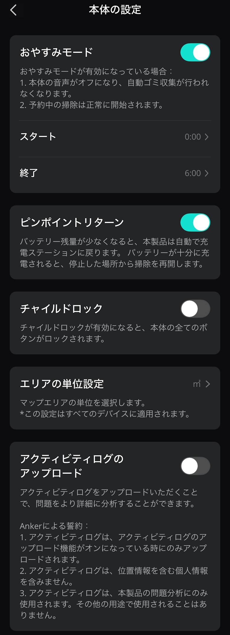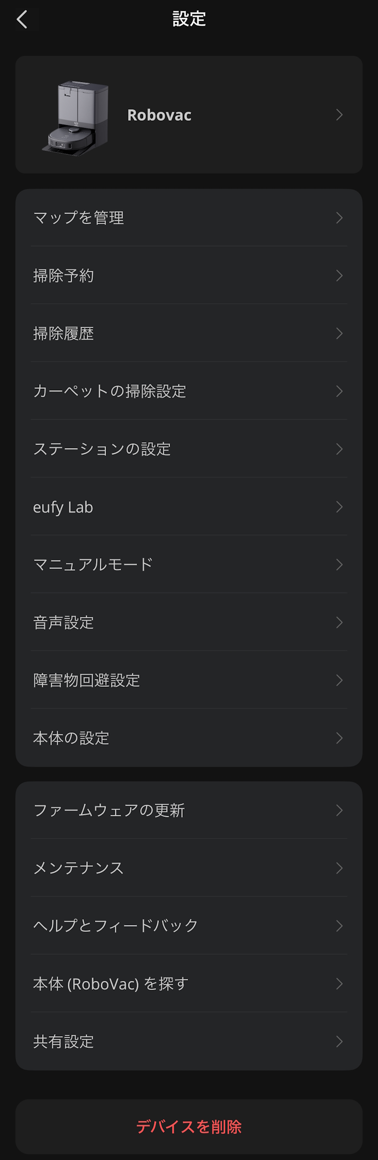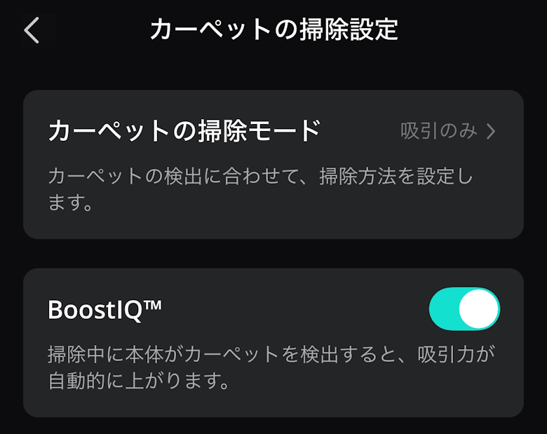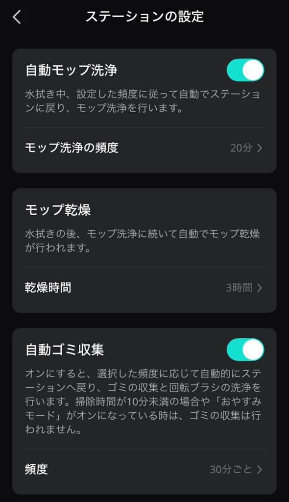 その他にもカーペットの掃除設定やステーションの設定など、細かい項目を確認・変更できます。