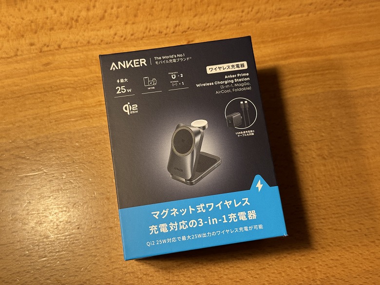 Anker Prime Wireless Charging Station (3-in-1, MagGo, AirCool, Foldable)」の外箱は、黒基調で青をアクセントカラーにしたクールなデザインです。