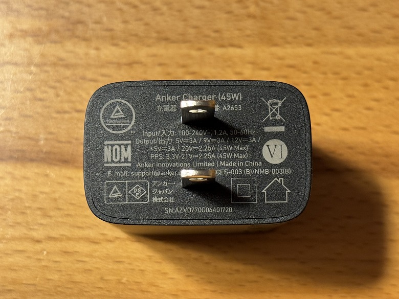 USB Type-C充電器も黒色で、側面に仕様が記載されています。