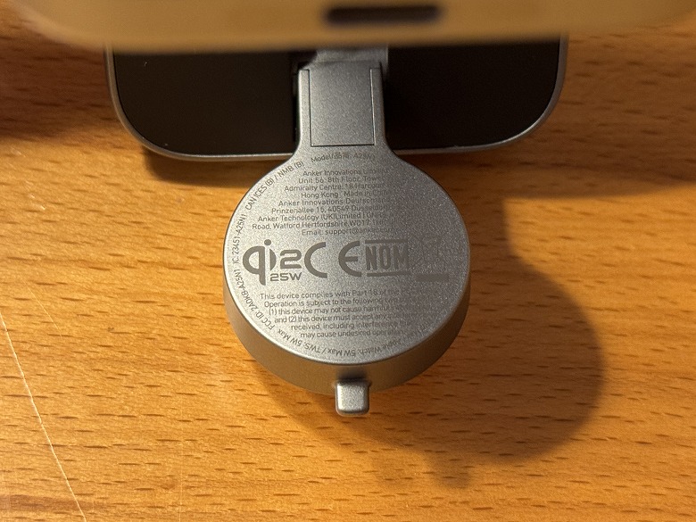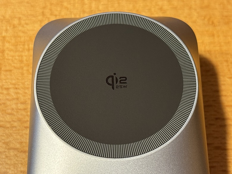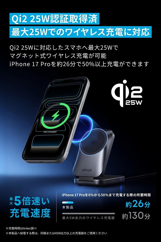 本機はQi2規格に対応し、最大25Wの高速ワイヤレス充電を実現。