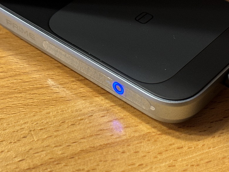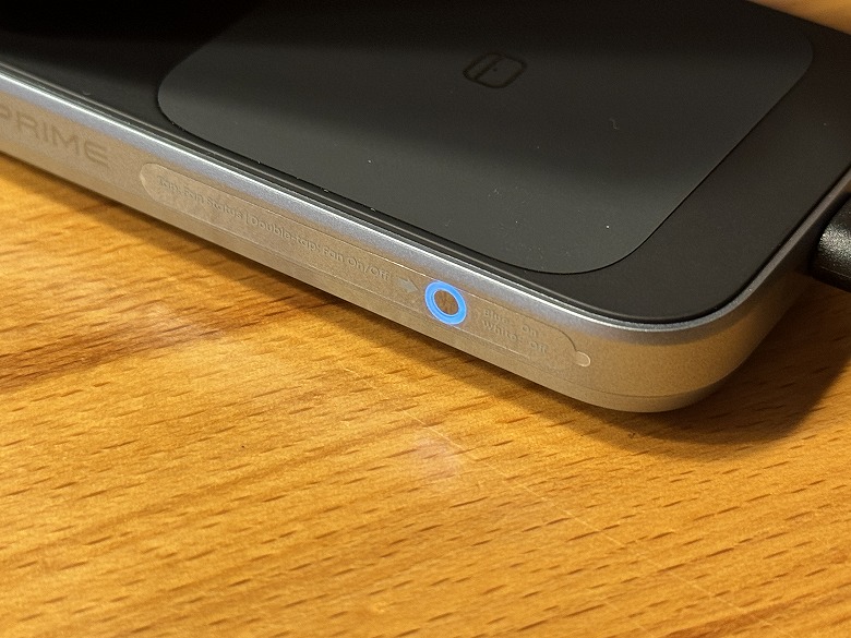 側面には冷却ファンをON/OFFできるタッチセンサーがあり、OFFは白、ONでは青にインジケーターが点灯します。