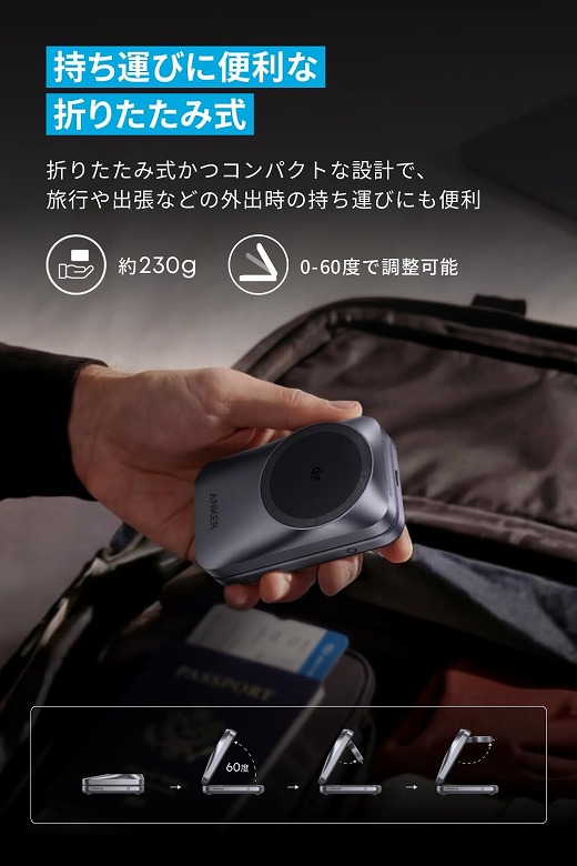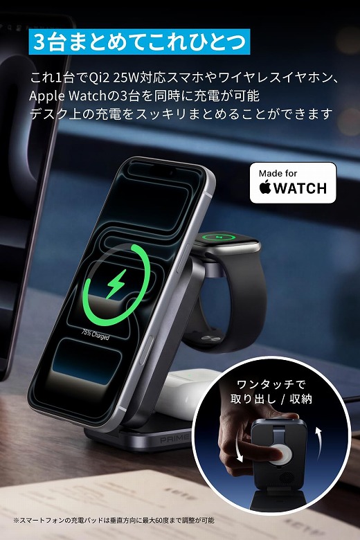 加えて、折りたたみ式のコンパクト設計と3台同時充電対応により、自宅のデスクから出張・旅行まで、あらゆるシーンで使いやすい設計に仕上がっています。