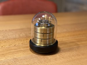 土台部分(黒)とドーム部分(透明)はアクリル樹脂、本体部分(ゴールド)は真鍮で作られています。