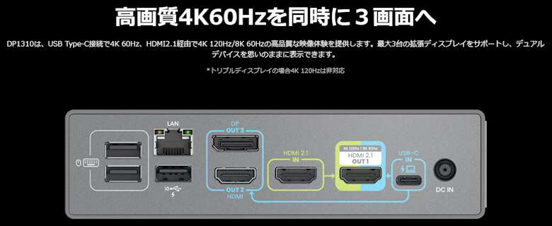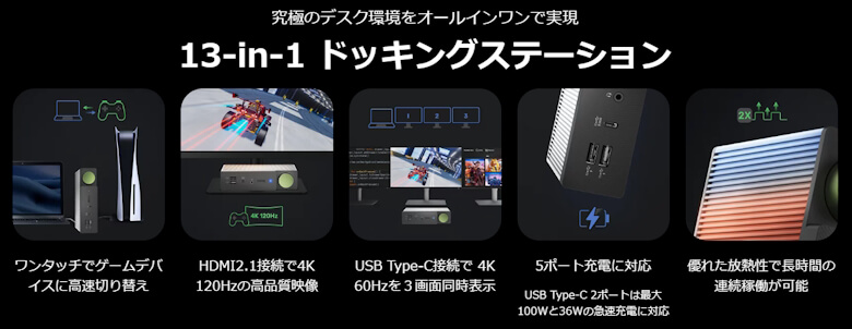 BenQの「beCreatus DP1310」は3画面拡張でトリプルディスプレイを実現でき、PCとゲームをワンタッチですぐに切り替えられる13-in-1ドッキングステーションです。