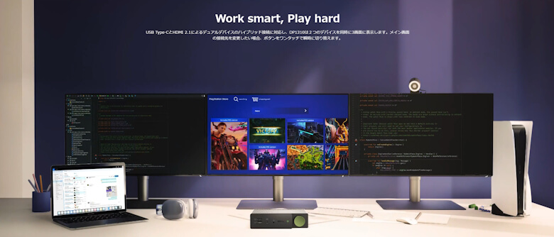 USB Type-CとHDMI 2.1によるデュアルデバイスのハイブリッド接続に対応し、2つのデバイスを同時に3画面に表示できます。
