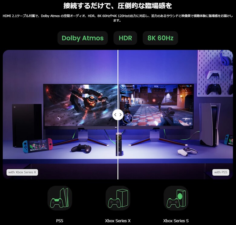 Dolby AtmosやHDR、8K 60Hz出力に対応しているので迫力あるサウンドと映像美を体感できます。