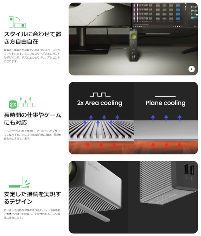 縦置き・横置きに対応し、放熱性が高く安定した接続を実現するデザインが採用されています。