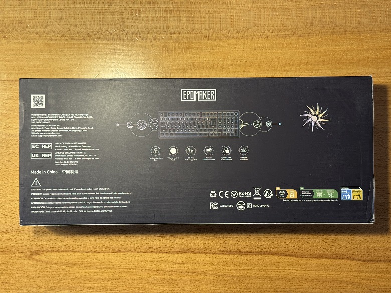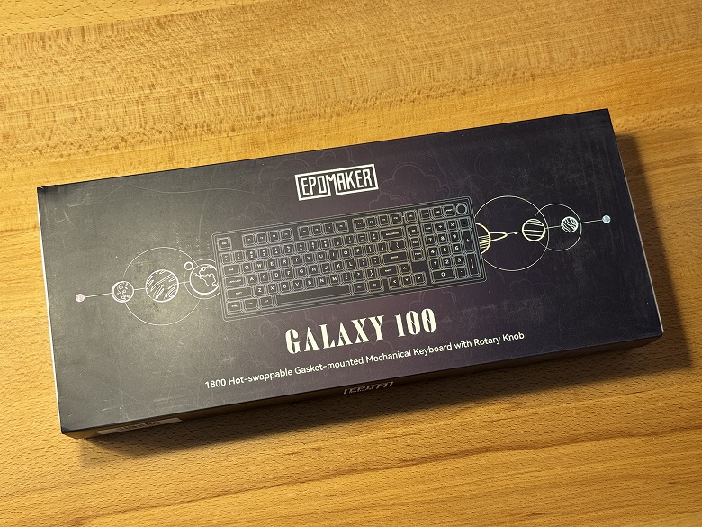 The outer box of the “Epomaker Galaxy100 QMK/VIA” features a cool design based on black.