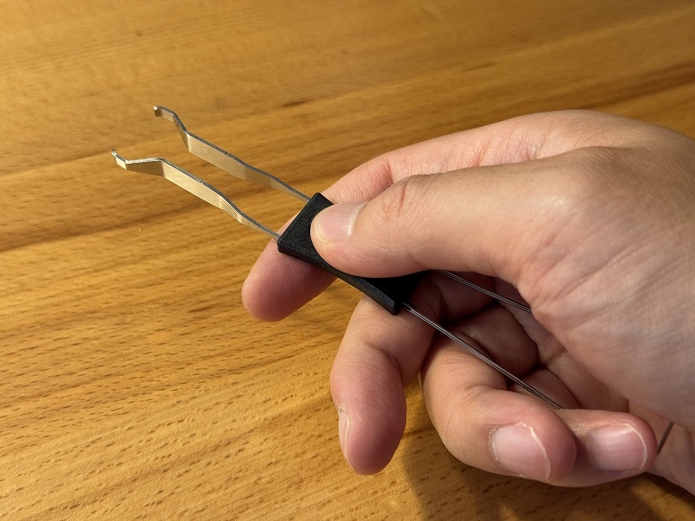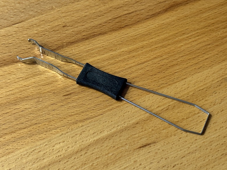 The tool has a keycap puller on one side and a key switch puller on the other side.