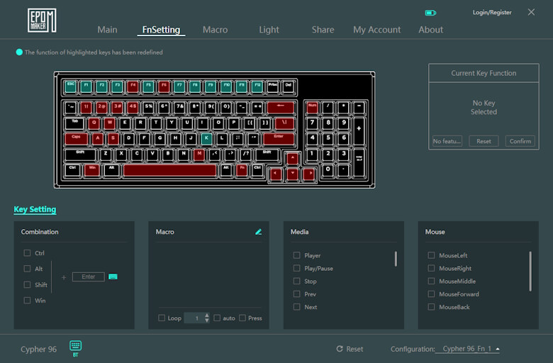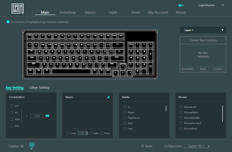 ソフトウェアではキーマップ変更などのカスタマイズができます。