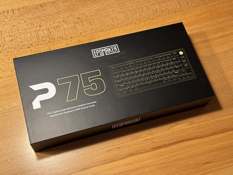 「Epomaker P75」の外箱は、黒を基調としたシンプルなデザインです。