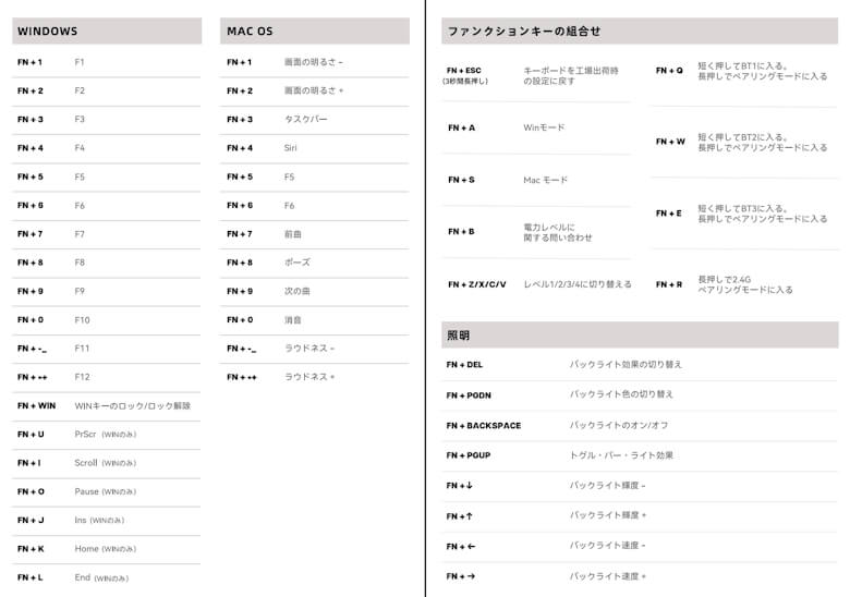 Fnキーとの組み合わせ一覧表は以下をご参考ください。