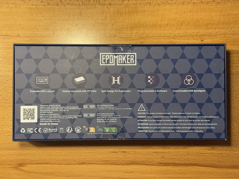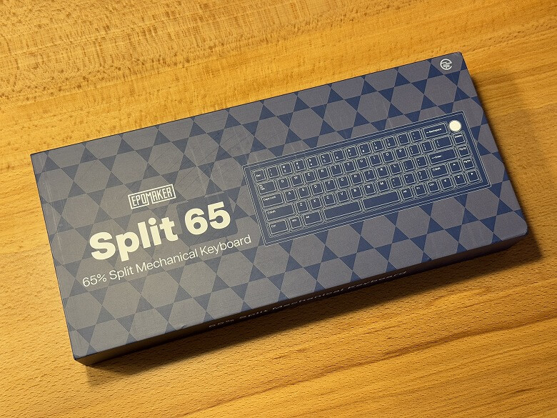 「Epomaker Split65」の外箱は、青を基調としたシンプルなデザインです。