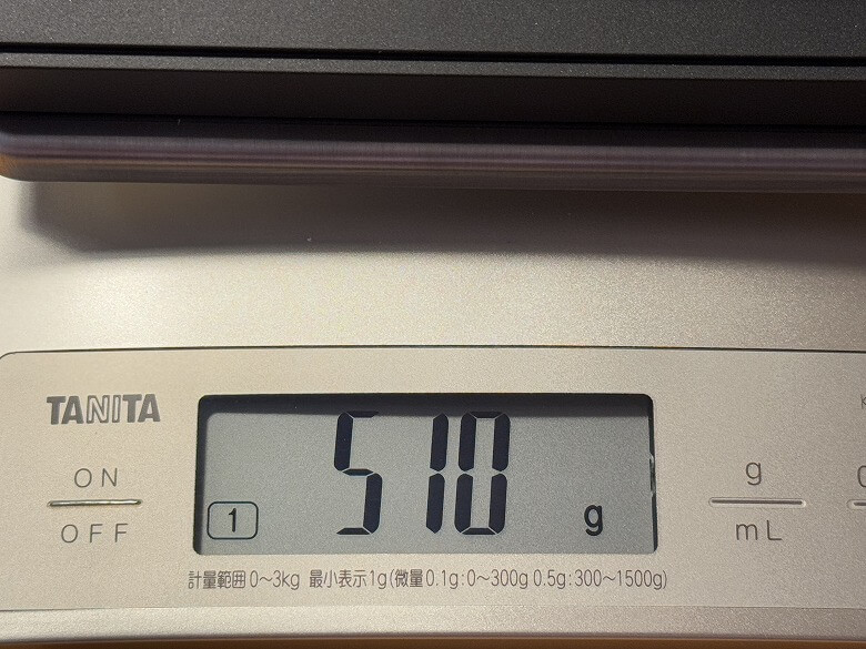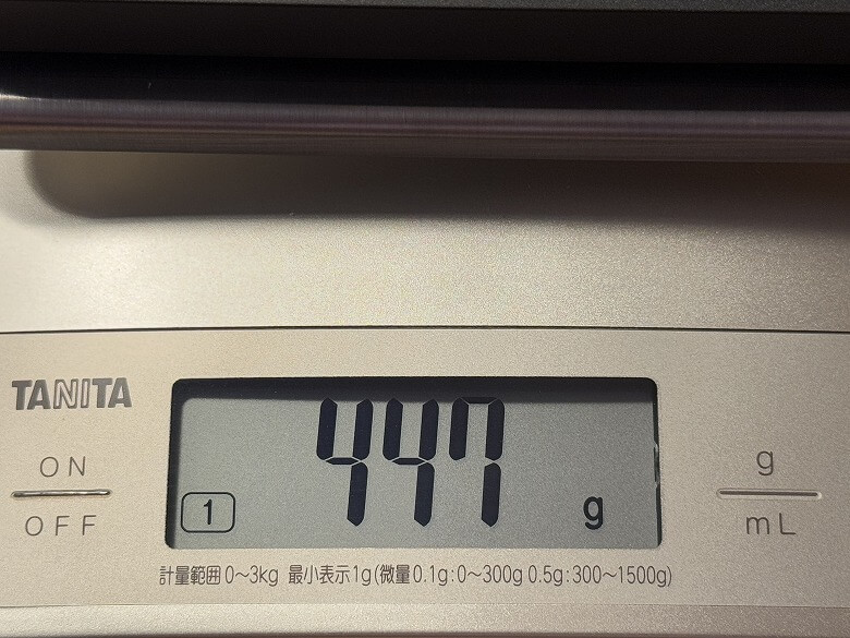 重さは左側が447 g、右側が510 gであわせて957 gでした。