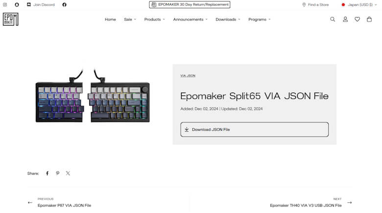 専用のVIA JSONファイルを公式サイトからダウンロードできます。