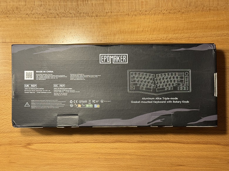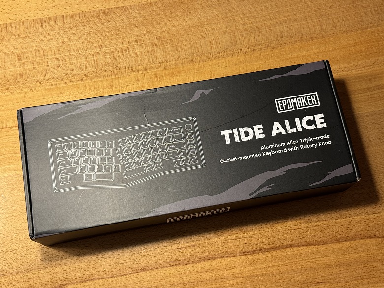 「Epomaker Tide Alice」の外箱は、黒を基調としたシンプルなデザインです。