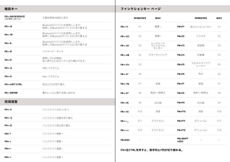 Fnキーとの組み合わせ一覧表は以下をご参考ください。