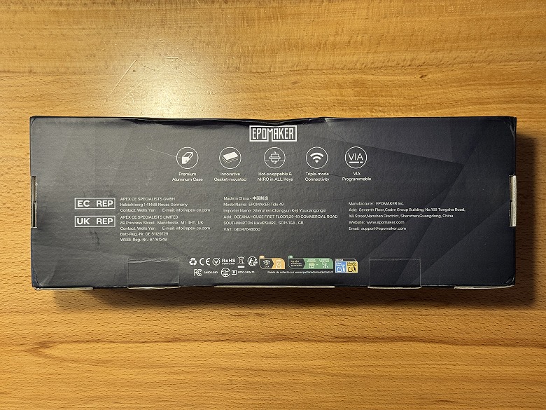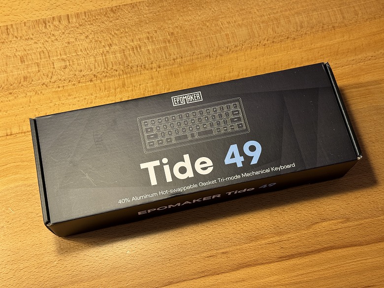 「Epomaker TIDE49」の外箱は、黒を基調としたクールなデザインです。