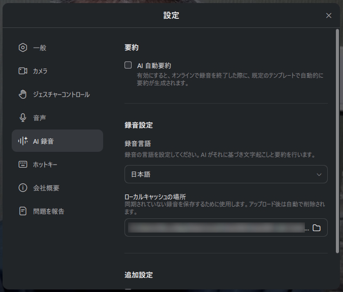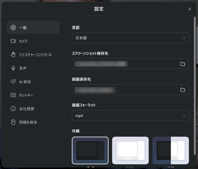 設定ではファイルの保存先やショートカットキーなどを確認・変更できます。