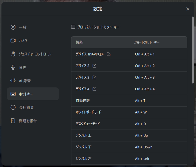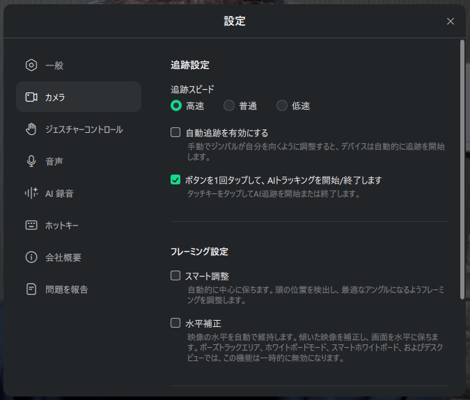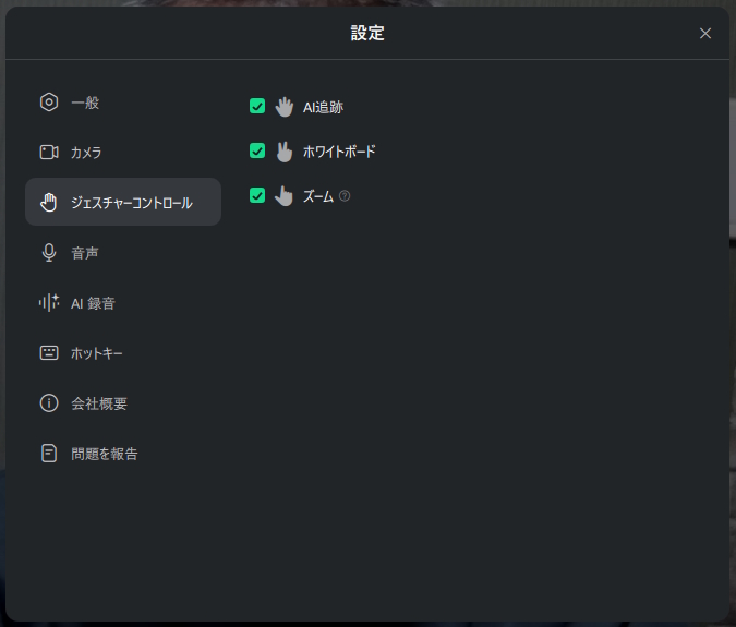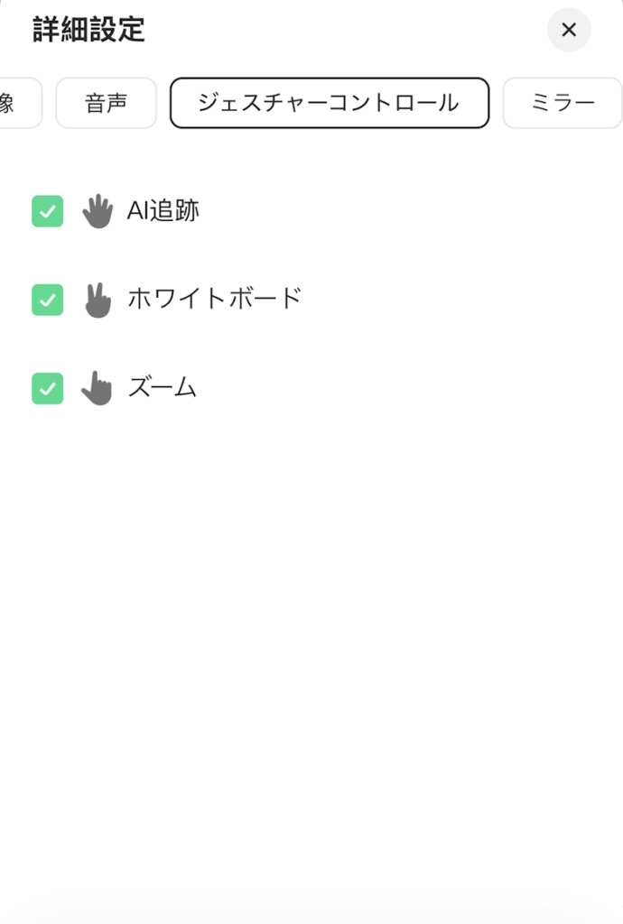 手のひらを挙げる、などのジェスチャーでAI追跡やホワイトボード、ズームなどの指示をすばやく出すことができます。